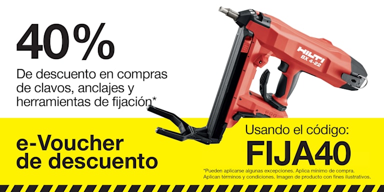 *Esta oferta promocional puede utilizarse solo 1 vez por cuenta de cliente. Válida para un descuento de 40% en compras de fijación (clavos DX/GX/BX, anclajes y herramientas relacionadas) de Hilti con un mínimo de CLP 500,000. Debe comprarse en Hilti Online y canjearse desde el 01.01.2026 hasta el 30/06/2026 11:59:59 PM. Quedan excluidos los pedidos de reparación, los servicios y el software. Este código sólo se puede canjear en línea y solo 1 vez por cuenta de cliente, tanto si se consume el valor total como si no. El importe de la compra no incluye gastos de envío. No puede combinarse con ninguna otra oferta. Este código promocional no es transferible. Este código no tiene valor en efectivo y no puede canjearse por dinero ni aplicarse a un saldo pendiente en su cuenta. Oferta nula donde esté prohibida o restringida por ley, reglamento o normas del cliente y sólo disponible hasta agotar existencias. Quedan excluidas todas las cuentas de alquiler y algunas instituciones, administraciones públicas, distribuidores autorizados y otros tipos de cuentas. Hilti puede cancelar las ofertas en cualquier momento sin previo aviso. Póngase en contacto con su representante de Hilti para más detalles.