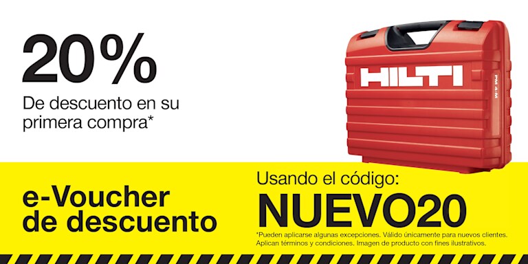 *Esta oferta promocional puede utilizarse solo 1 vez por cuenta de cliente. Sólo es válida para un descuento de 20% en compras elegibles de Hilti. Debe comprarse en Hilti Online y canjearse desde el 01/01/2026 hasta el 31/12/2026 11:59:59 PM. Quedan excluidos los pedidos de reparación, los servicios y el software. Este código sólo se puede canjear en línea. El importe de la compra no incluye gastos de envío. No puede combinarse con ninguna otra oferta. Este código promocional no es transferible. Este código no tiene valor en efectivo y no puede canjearse por dinero ni aplicarse a un saldo pendiente en su cuenta. Oferta nula donde esté prohibida o restringida por ley, reglamento o normas del cliente y sólo disponible hasta agotar existencias. Quedan excluidas todas las cuentas de alquiler y algunas instituciones, administraciones públicas, distribuidores autorizados y otros tipos de cuentas. Hilti puede cancelar las ofertas en cualquier momento sin previo aviso. Póngase en contacto con su representante de Hilti para más detalles.
