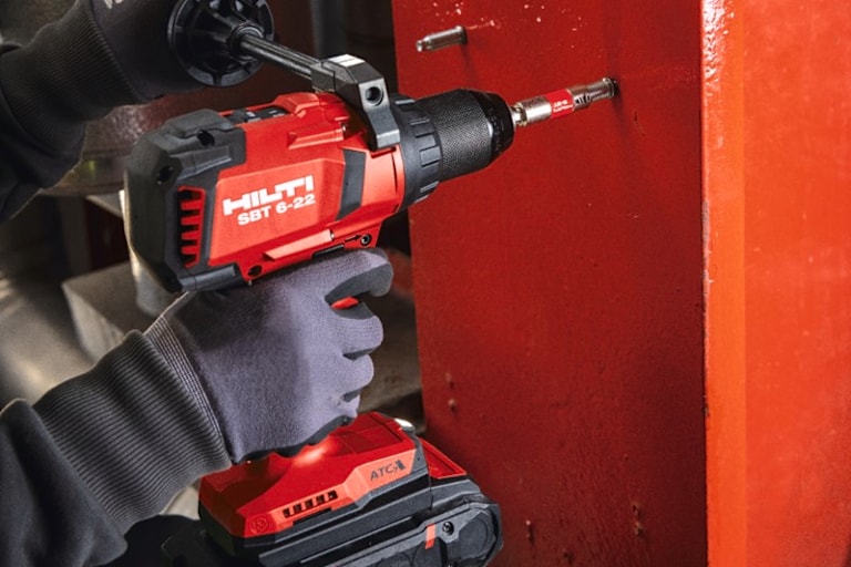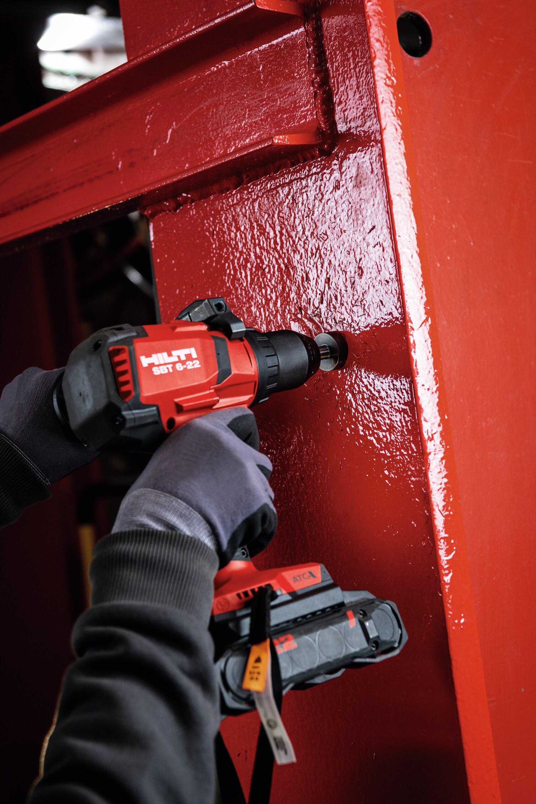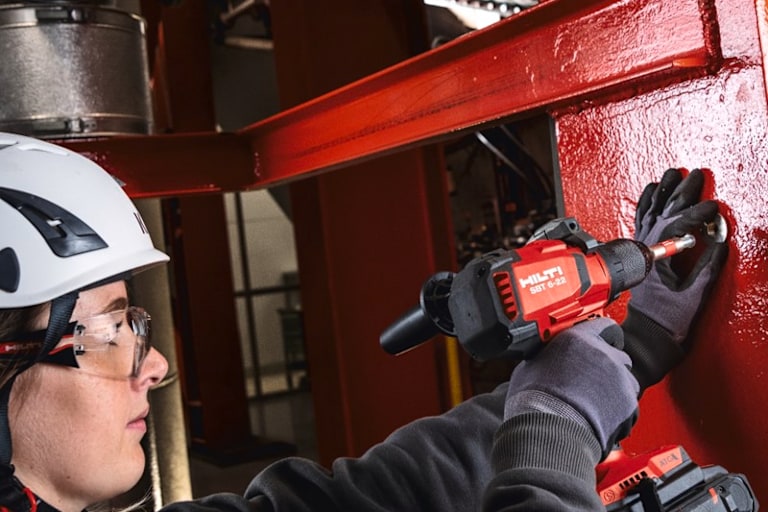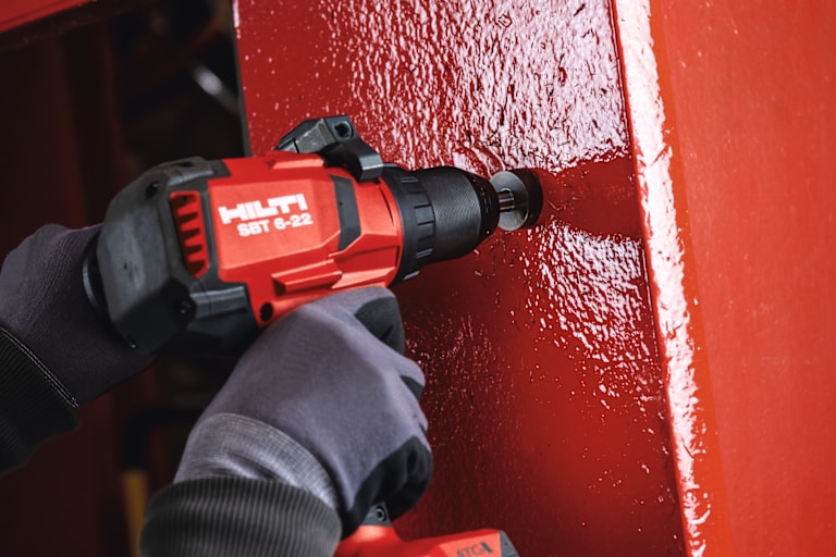 Fije los conectores S-BT a materiales metálicos base en solo tres pasos utilizando una única herramienta: preperforación, instalación y fijación de la tuerca. Los algoritmos integrados en la herramienta aceleran la instalación hasta en un 60 % en comparación con los métodos tradicionales. No es necesario realizar una preparación previa del hábitat (excepto en entornos ATEX) y no se requieren medidas adicionales de protección contra la corrosión.
