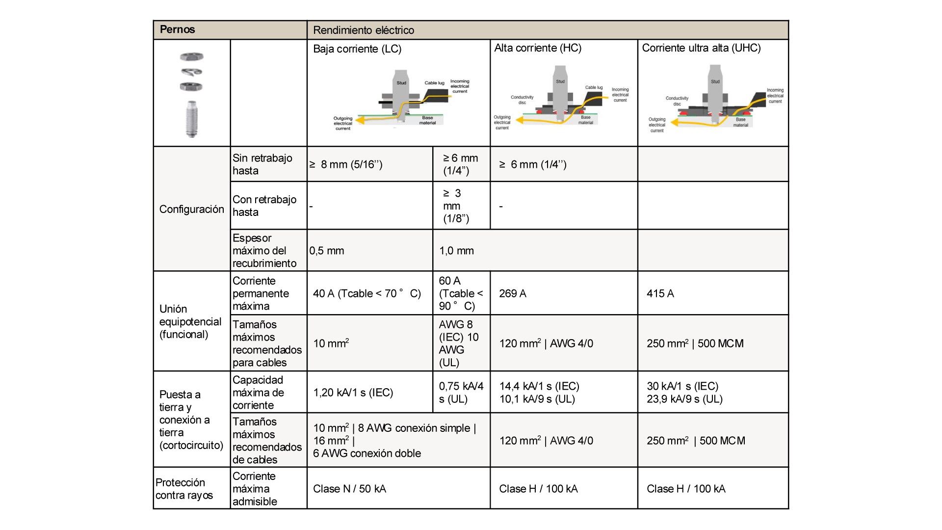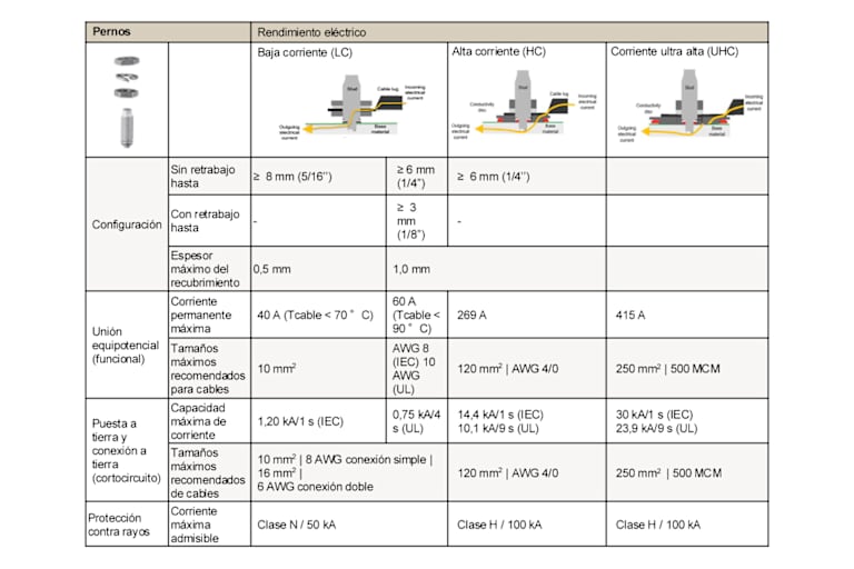 Factores como el nivel de corriente eléctrica, el espesor del recubrimiento del acero, la capacidad de cortocircuito o el diámetro del cable pueden variar según el tipo de instalación.